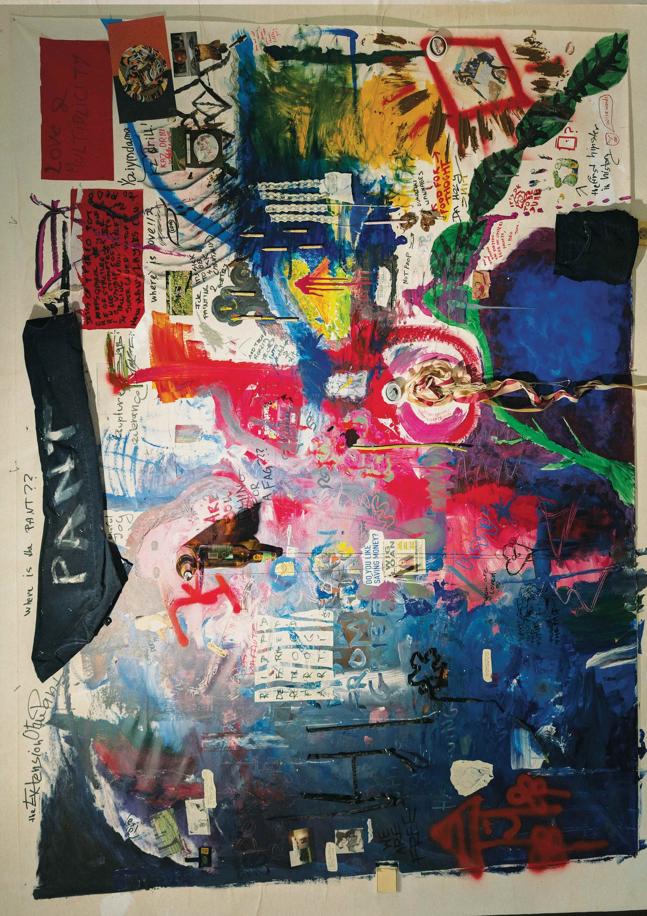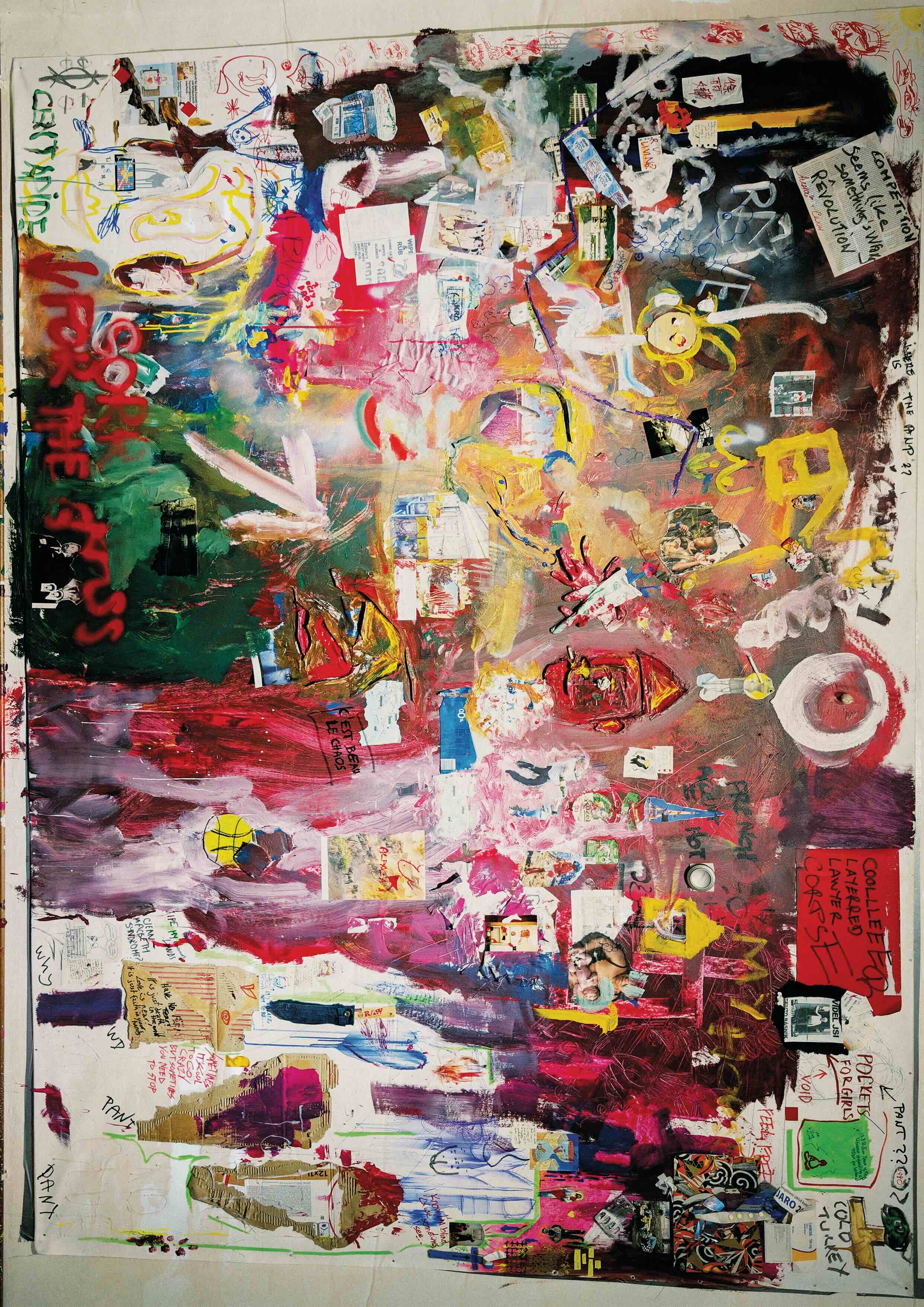 For the first event, the objective was to observe how visual communication patterns are created in real time through community collage and chaos. We erected two large blank canvases in the gallery and asked community members to deface them with whatever methods, motives, or motifs were at their disposal. What resulted were two community works shaped entirely by the moment.
