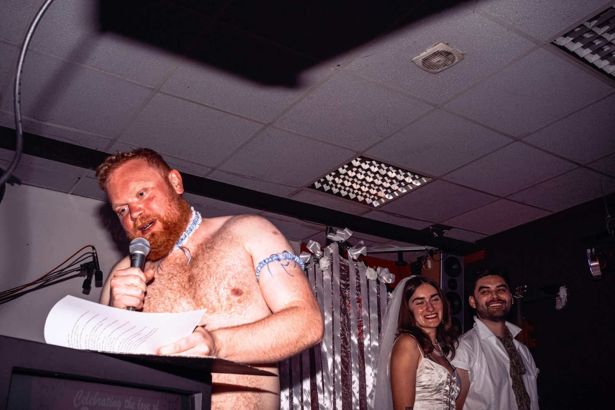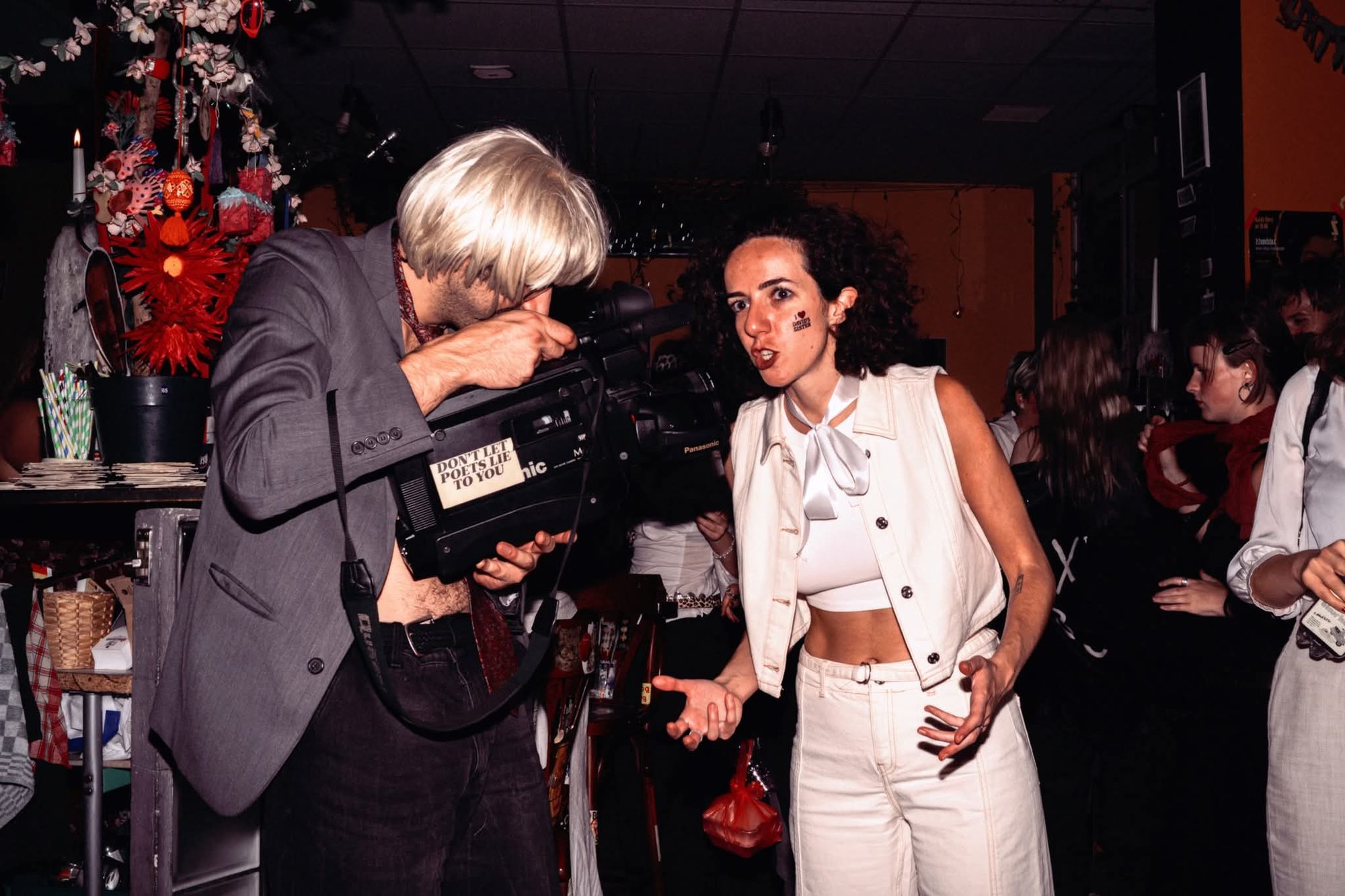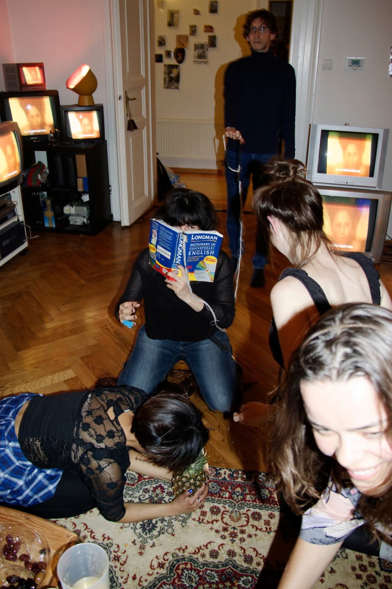 At the end of the month, Tyko and Sandra celebrated their second wedding—this time in Žižkov, where attendees came dressed in their best wedding dresses. The event started with performances by long-time O:P friends (China Soup, Alpha Strategy) and ended with a final performance by Tyko and Sandra’s no-wave project: David’s Sister. The night was officiated by Jaromír Lelek, who stood shirtless in ceremony surrounded by stacks of TVs playing analogue mixes that stated: “Tonight, we all get married.”